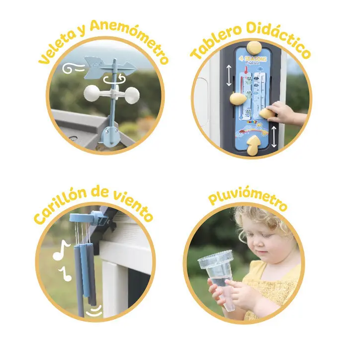 Casa temática del tiempo y las estaciones. La casa 4 estaciones tiene 1 puerta de plástico soplado, 2 ventanas con lamas y contraventana corredera, en la que el niño puede dibujar con tiza. Muchas actividades que permitirán a sus hijos comprender los fenómenos meteorológicos de forma lúdica. El carillón, la veleta, el anemómetro y el pluviómetro permitirán a sus hijos observar la dirección y velocidad de el viento y medir el nivel de lluvia. íCuando terminen de observar, es hora de anotar los datos! El tablero didáctico ayudará a sus hijos a marcar la estación, la temperatura, el nivel de lluvia según sus observaciones pero también anotar el tiempo de ese día. Las paredes de la casa están decoradas con dibujos de animales (pájaros, mariposas, etc.) en relieve. Está tratado con anti-UV para garantizar una buena resistencia. y el mantenimiento de los colores a través del tiempo. Estructura estable y resistente. Fácil de montar.
