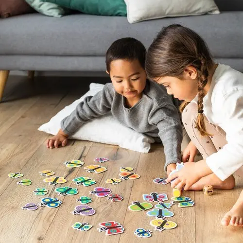 Juego preescolar de velocidad visual: se colocan las piezas sobre la mesa y se lanzan los 3 dados por turnos. Hay que encontrar la combinación: tamaño de la mariposa + los colores que aparecen en el dado. El primer jugador que encuentre la combinación correcta gana la pieza. Si al tirar el dado ya esta cogida la ficha se vuelve a tirar. Para los jugadores más pequeños, pueden empezar jugando sólo con los dados de colores y las mariposas de un único tamaño para que sea más fácil. íEl niño o niña que recopile más piezas gana la partida! Existe otra modalidad de juego de memoria: todas las piezas se colocan boca abajo quedando de un único color. Habrá que emparejar las mariposas por su forma y color.
