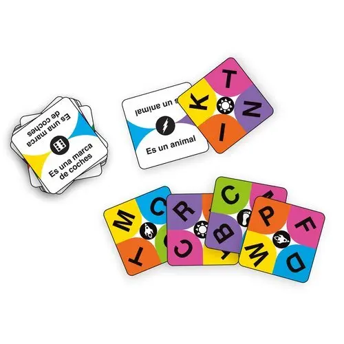 ¿listo para un juego superrrápido y supersimple? íRápido!, es una bebida con gas que empiece por "C". Es una orden que le das a un perro que empiece por "S" Facil, ¿verdad? Ahora ya sabes como jugar a ESZI. ESZI viene con 75 cartas de letras y 120 cartas de pista. íESZI es velocidad! Sé el primero en deshacerse de tus cinco cartas de letras.
