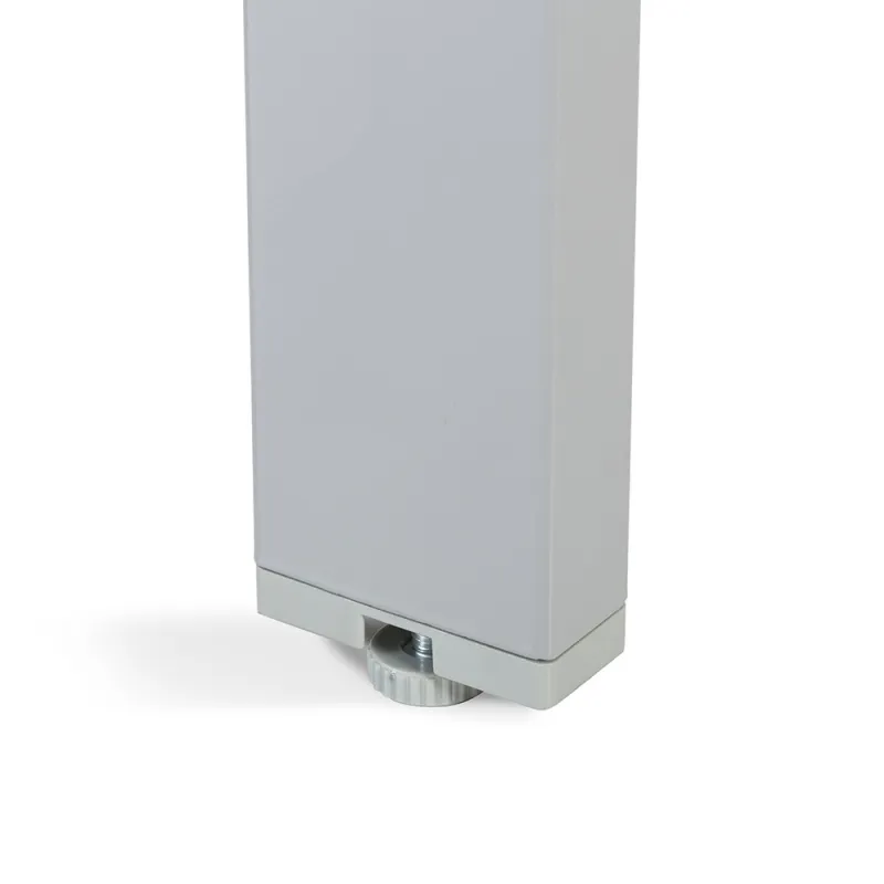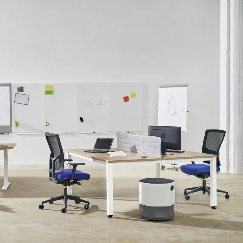 Estructura realizada en tubo de acero de 30 x 30 mm de sección fijados entre ellos y a los 2 pies mediante 4 piezas de plástico inyectado. Los pies son de tubo de acero 70 x 30 mm de sección e incorporan niveladores de regulación en altura de 2 cm. Todo ello pintado según modelo. El tablero es de melamina de 25 mm de grosor color según producto canteado en PVC de 1 mm del mismo color.