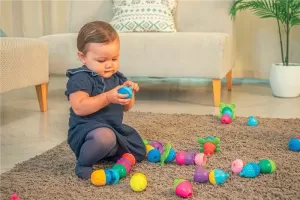 12 gambitas se han escapado en el baño, ¡hay que atraparlas rápidamente! Gracias a las pinzas su hijo podrá pescar cada una de las gambas que flotan en la superficie del agua y colocarlas en una bonita cesta que se fija en la loza gracias a sus ventosas. Este juego le permitirá a su hijo desarrollar la destreza mientras se divierte en el baño. Juguete para el baño para niños a partir de 2 años.